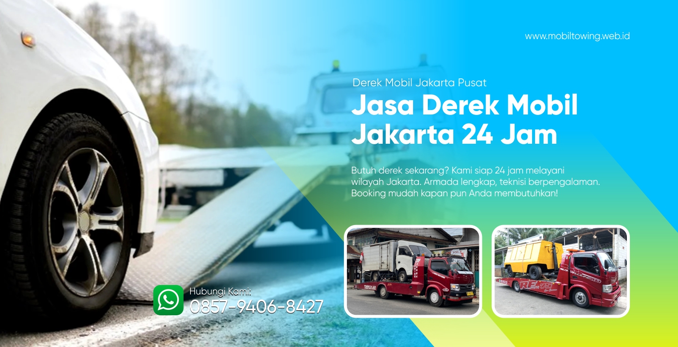 Layanan derek mobil 24 jam untuk kondisi darurat seperti mogok, kecelakaan, atau banjir. Siap datang ke lokasi Anda di seluruh wilayah DKI Jakarta